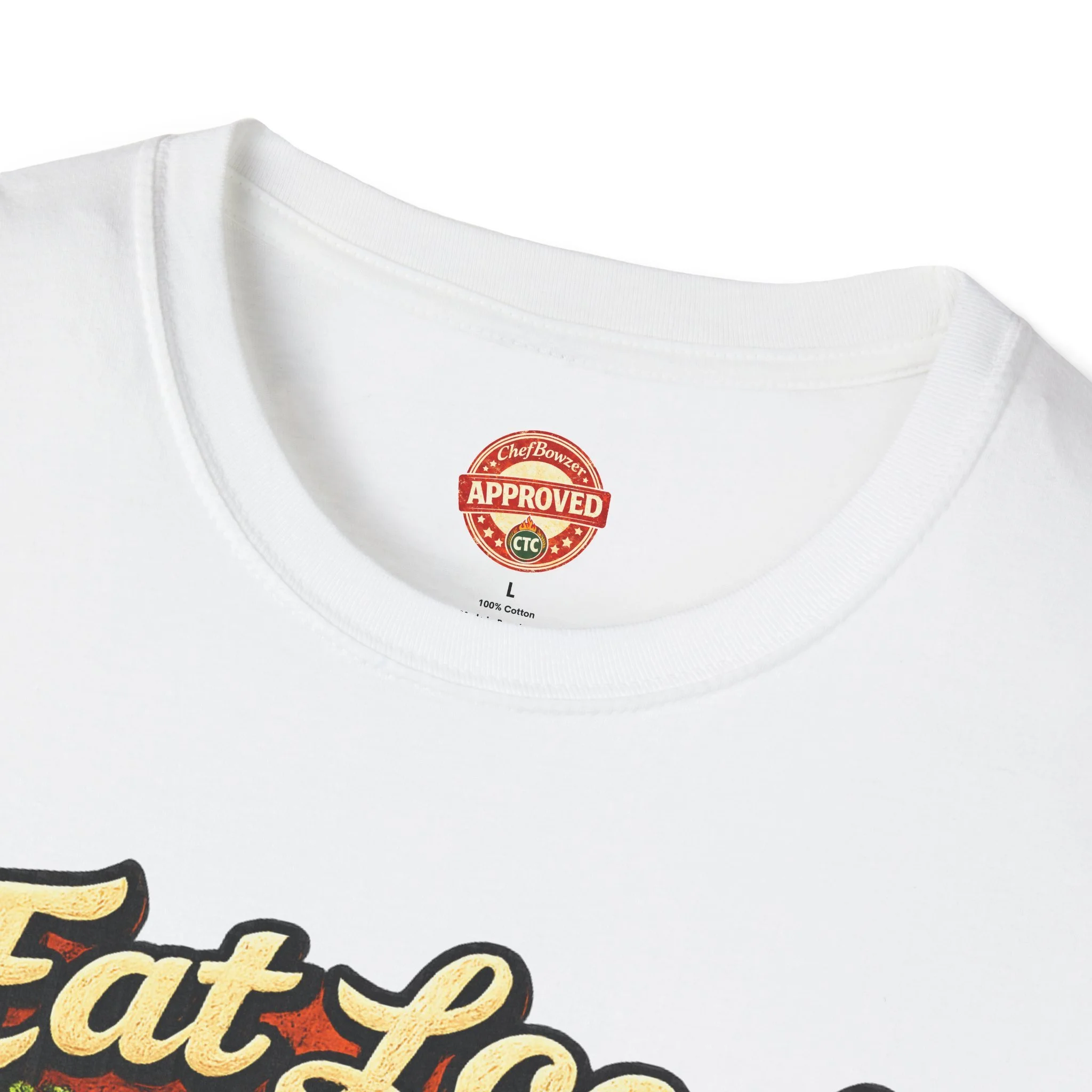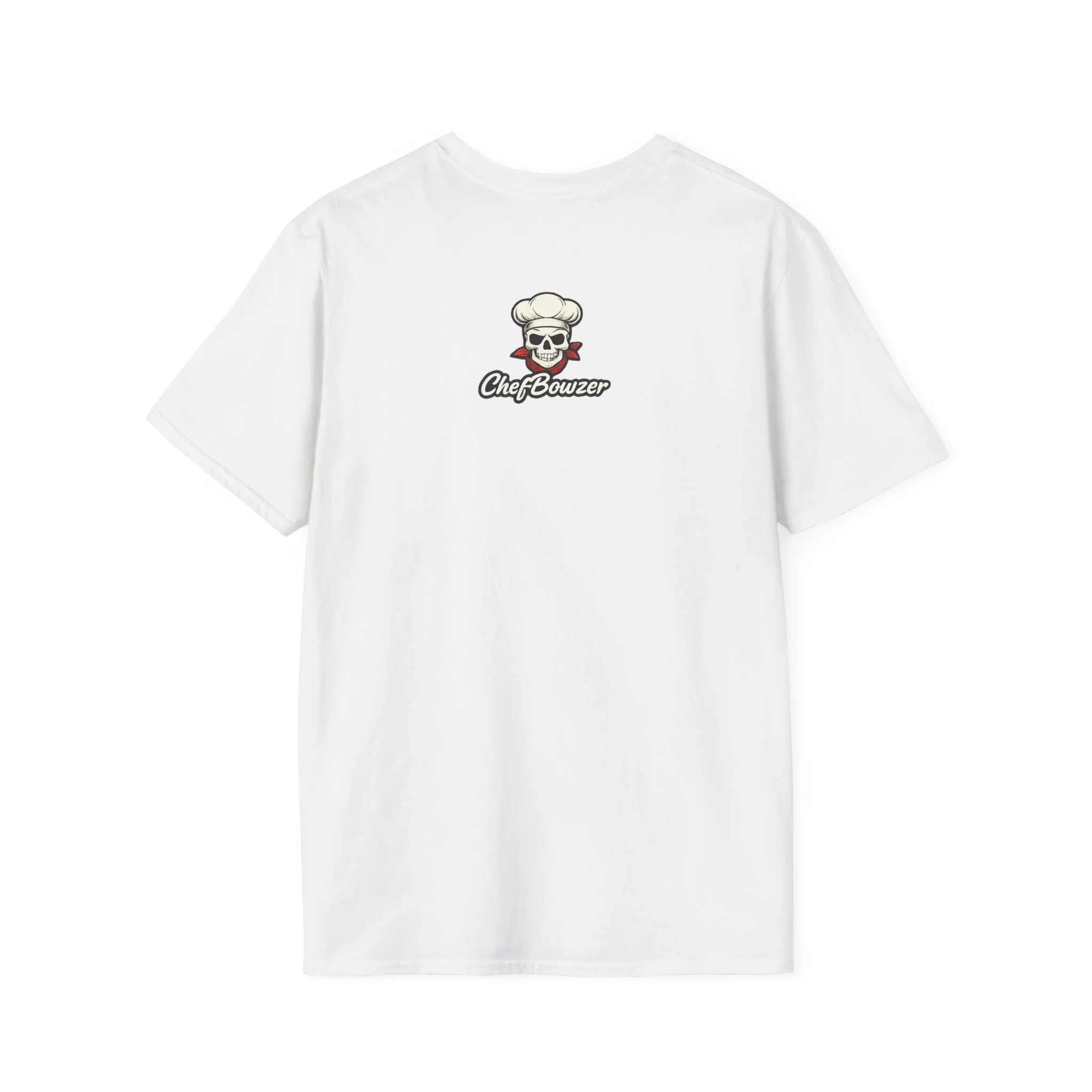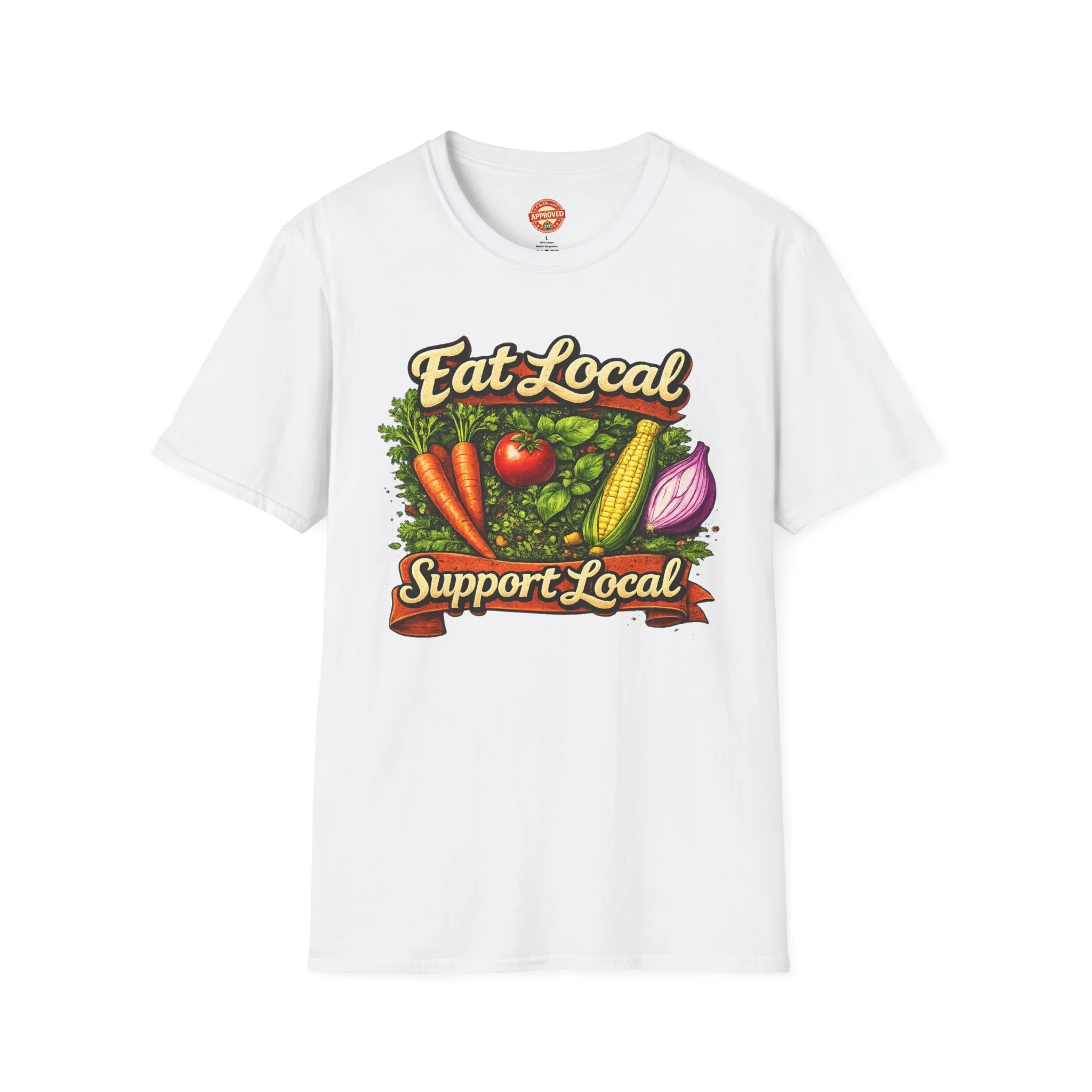 This T-shirt carries a bright, homegrown message: vintage-style produce artwork declares “Eat Local / Support Local” across the chest, while a small chef-skull logo sits on the upper back. The colors are warm—rich greens, tomato red, carrot orange and golden corn—printed crisply on a soft white tee. Wear it to farmers’ markets, casual kitchen shifts, or weekend meal prep and it reads like a friendly neighborhood statement: you care about where food comes from and who grows it. The crew neck and classic fit keep the silhouette familiar and easy to layer under an apron or a light jacket. The fabric is lightweight and breathable, so the shirt feels lived-in from the first wear while holding up to repeated washing and printing detail over time.