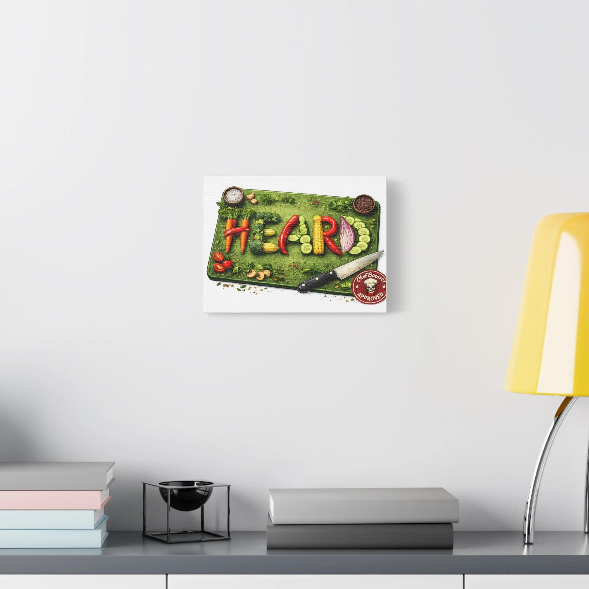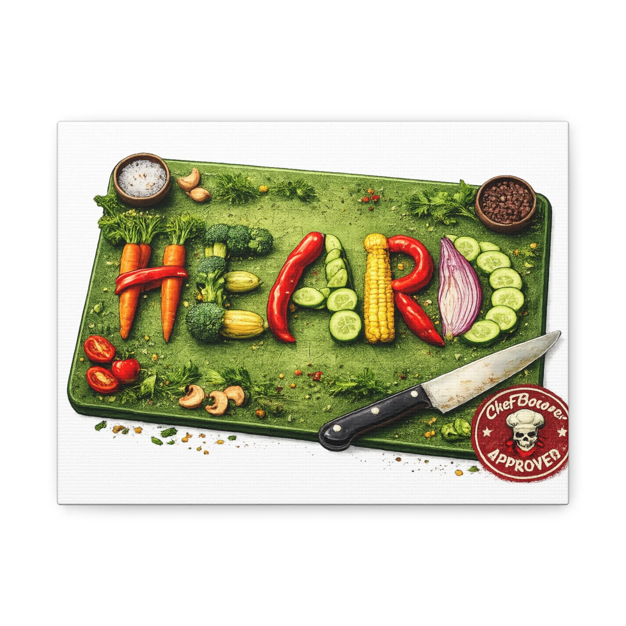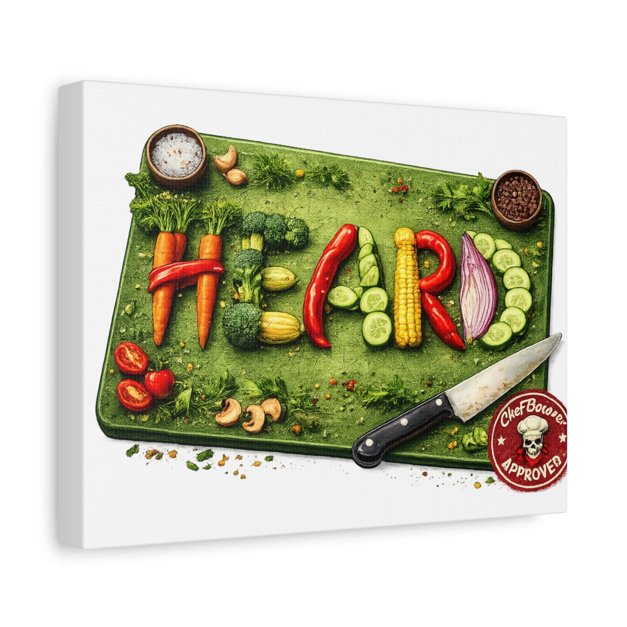 Bright, playful kitchen art that celebrates healthy cooking and fresh ingredients. This stretched matte canvas shows a colorful chopping board scene where peppers, corn, cucumber, onion and herbs are arranged to spell HEALTH — complete with a chef’s knife and seasoning bowls. The textured matte surface keeps glare low so the illustration’s rich greens and jewel-toned vegetables read clearly from across the room. Hung in a cozy kitchen, cafe wall, or dining nook, it brings a warm, food-loving energy and a hand-crafted feel to the space.