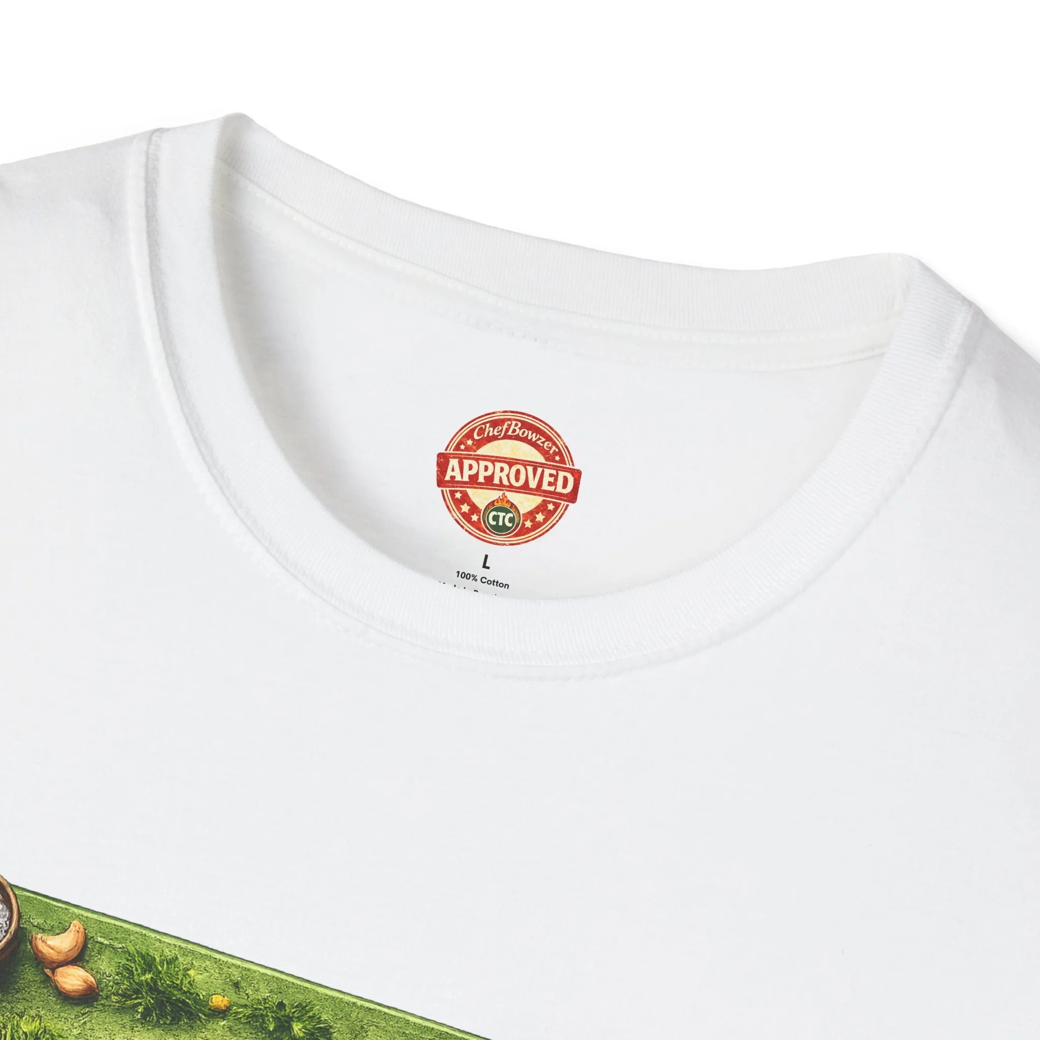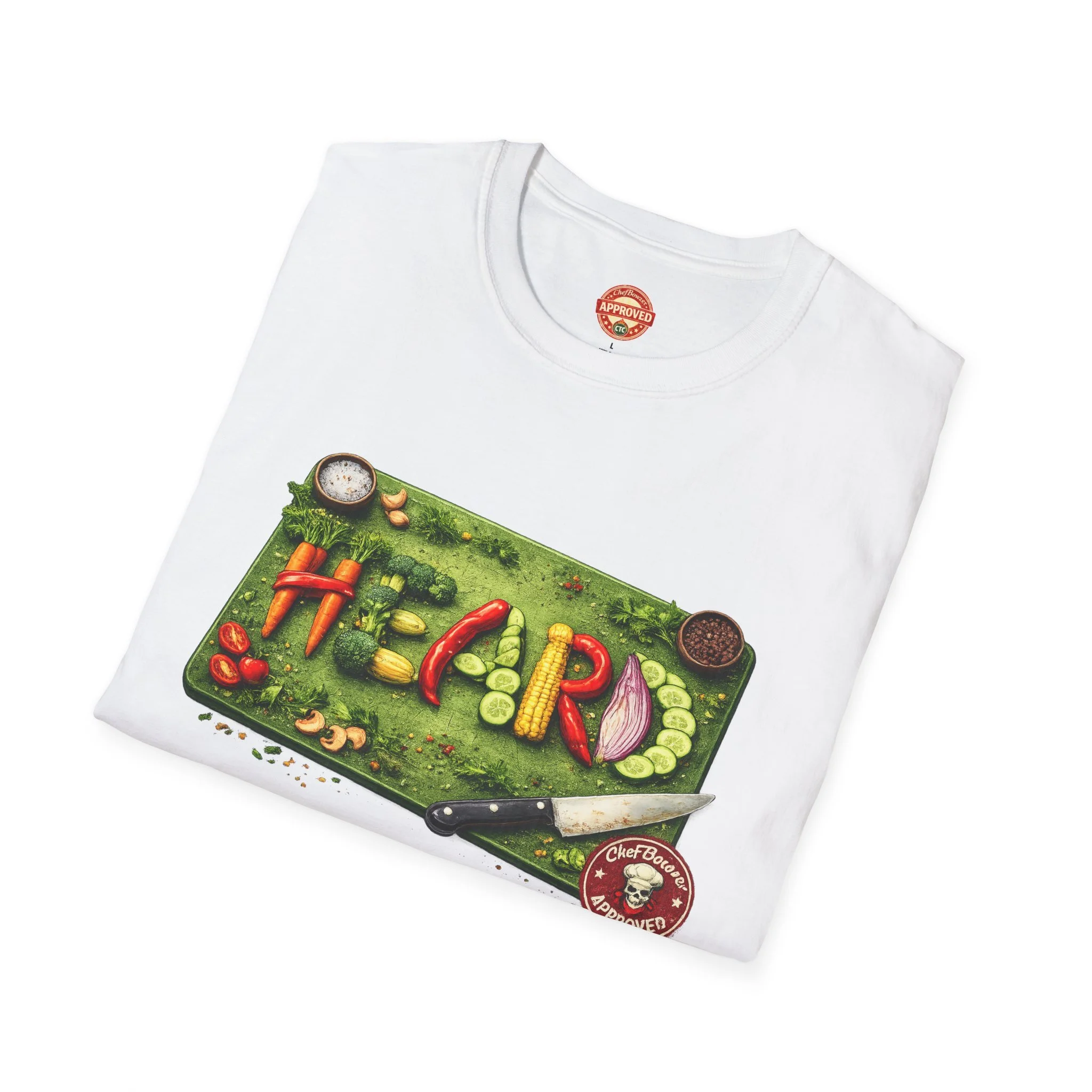 This lightweight cotton tee brings kitchen energy into everyday wear. A vibrant chopping-board illustration sits across the chest — colorful veggies, a cleaver and scattered herbs form the word "HEARD" in a playful, hand-crafted layout. A small chef emblem rests between the shoulders on the back, a subtle nod to culinary pride. The shirt feels soft against the skin and drapes casually, so it moves with you whether you’re cooking, running errands, or meeting fellow food lovers. It’s warm, friendly, and a little cheeky — for people who cook with joy and like to wear that feeling.